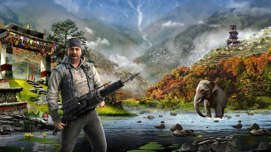 1366x768far Cry 4 Bakgrund Man Som Står Ansikte Mot Ansikte Med En Mammut -