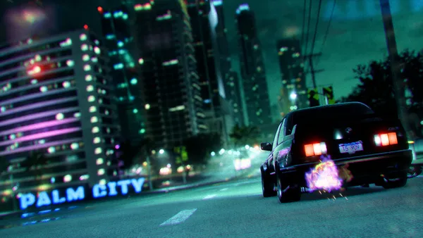• Enbil Som Kör Nerför En Stadsgata Med Neonskyltar.