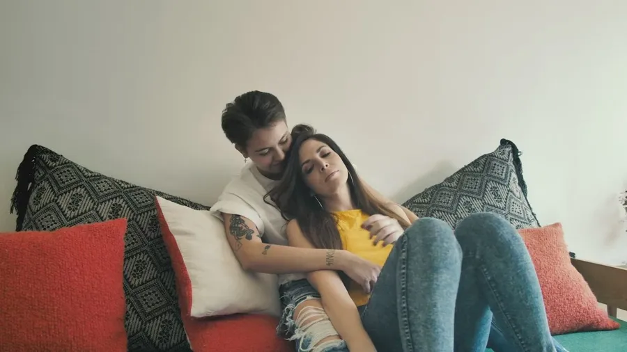 Ettpar Som Sitter Tillsammans På En Soffa -
