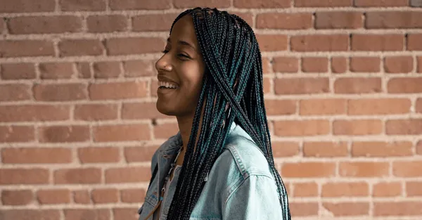 Frisyrermed Flätor 2022. Bild På En Leende Kvinna. -