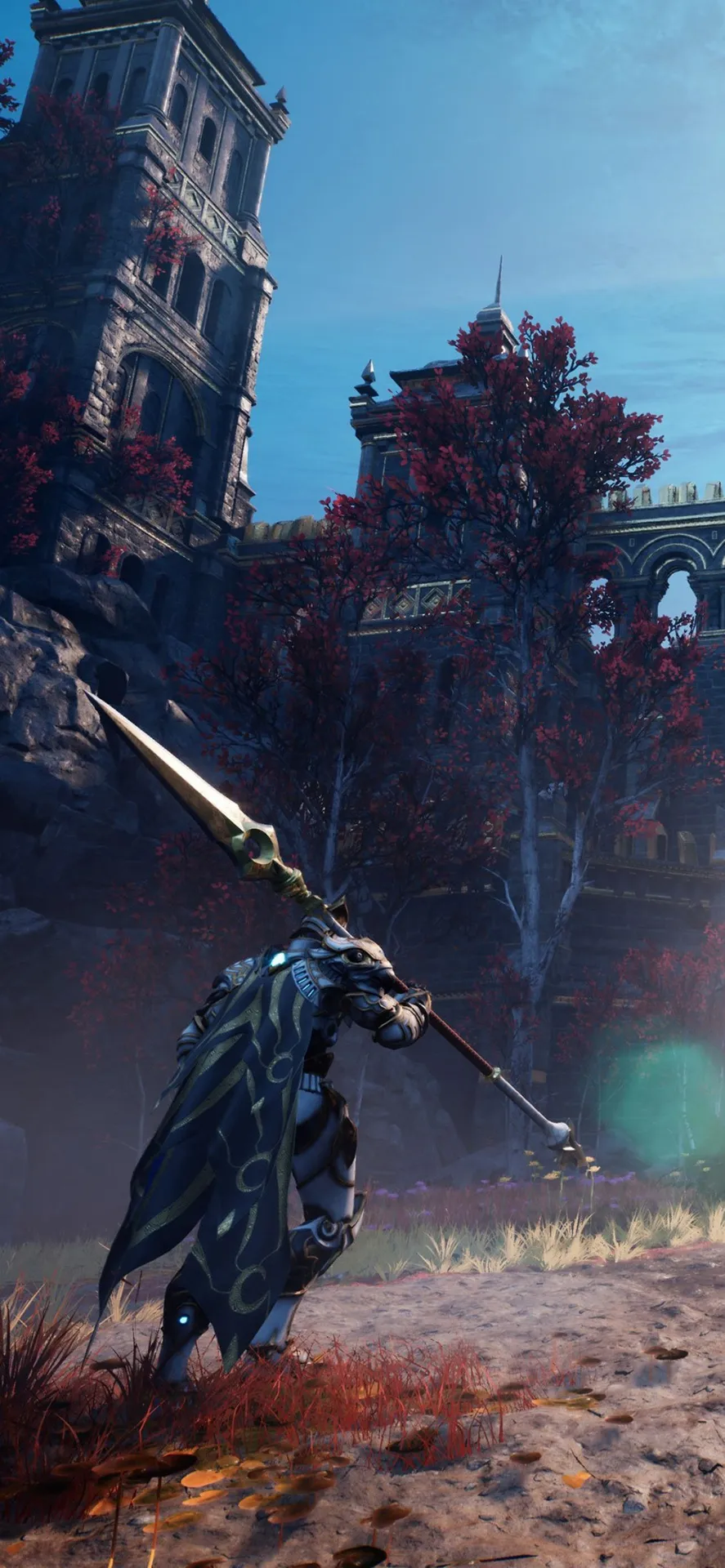 Iphonexs Bakgrundsbild Med Godfall, Med En Person Som Går I Ett Slott. -