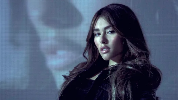Enkvinna Med Långt Hår Poserar Framför En Skärm Wallpapers -