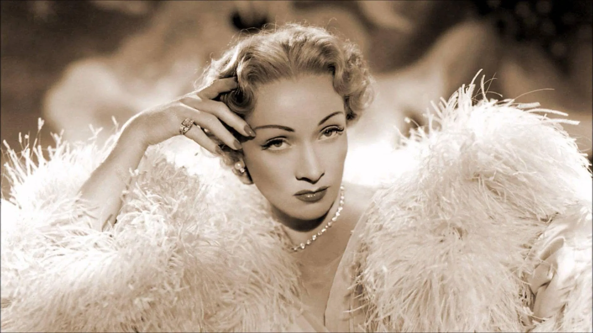 Marlenedietrich Poserar I En Klänning Med Svarta Fjädrar. -