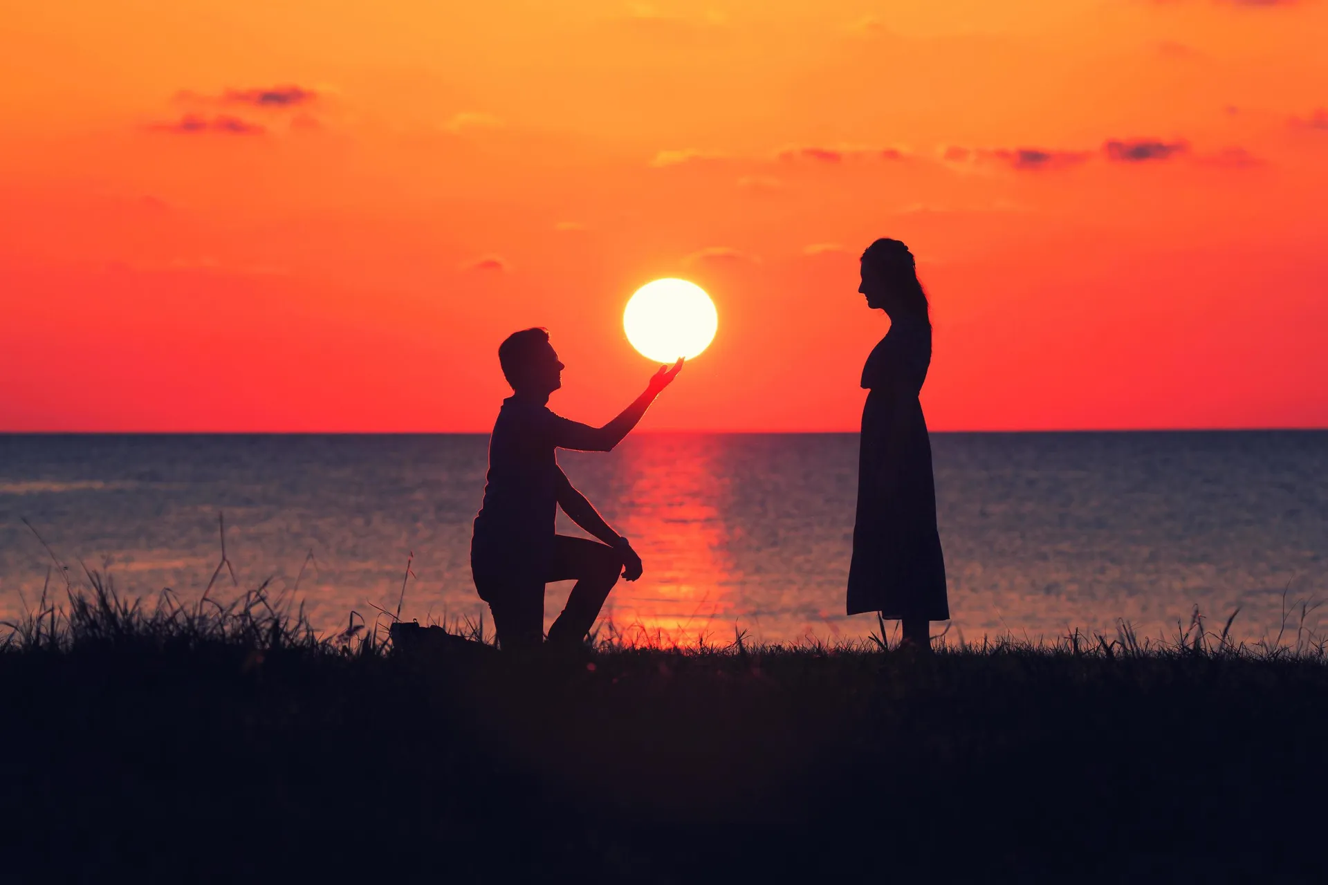 Parsom Njuter Av Solnedgången På Gräset Med Utsikt Över Havet. -