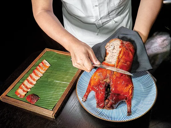 Rostadpekinganka På En Svart Serveringsplatta. -