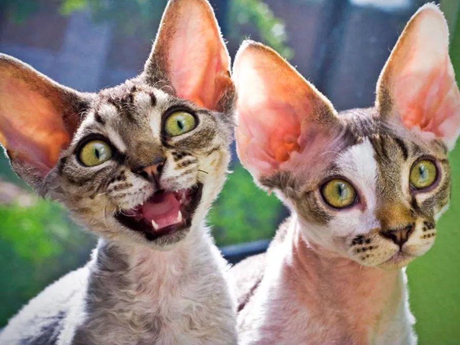 Tvåsphynx-katter Ler Och Tittar Mot Kameran På Tapeten Till Datorn Eller Mobilen. -