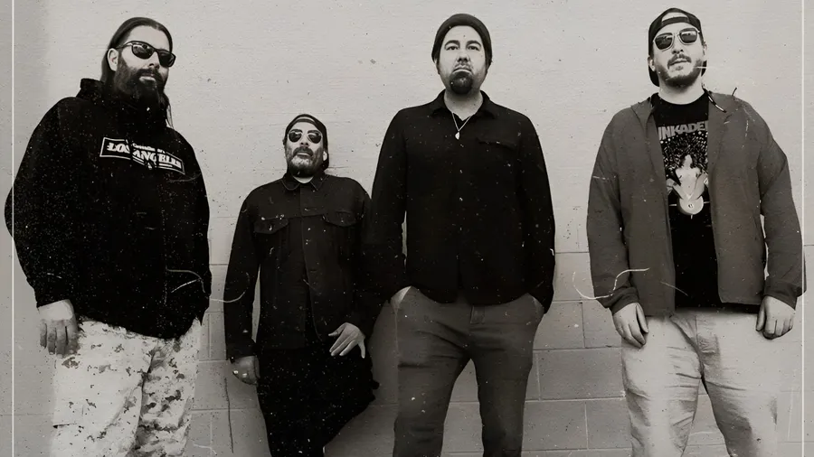 Svart Och Vit Foto Av Fyra Deftones-medlemmar Som Står Mot En Vägg Och Visar Sin Avslappnade Stil Och Bandets Enhet.
