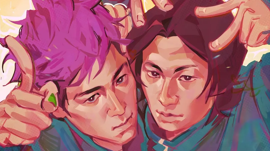 Konstnärlig Avbildning Av Två Huvudkaraktärer Från Squid Game Med Livfulla Färger Och Dynamiska Poser Inspirerade Av Thanos-temat.
